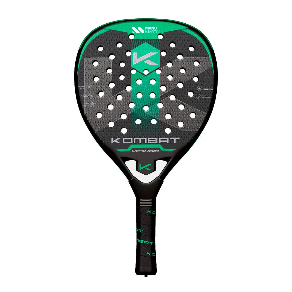 The Kombat Vesubio 2025 Manu Martin is a diamond-shaped padel racket from Kombat, released in 2025, that leans toward an attacking, versatile profile. With a high balance, medium-soft dual-density EVA core, and an 18K carbon rough face, it pairs soft touch with strong ball output for advanced players.