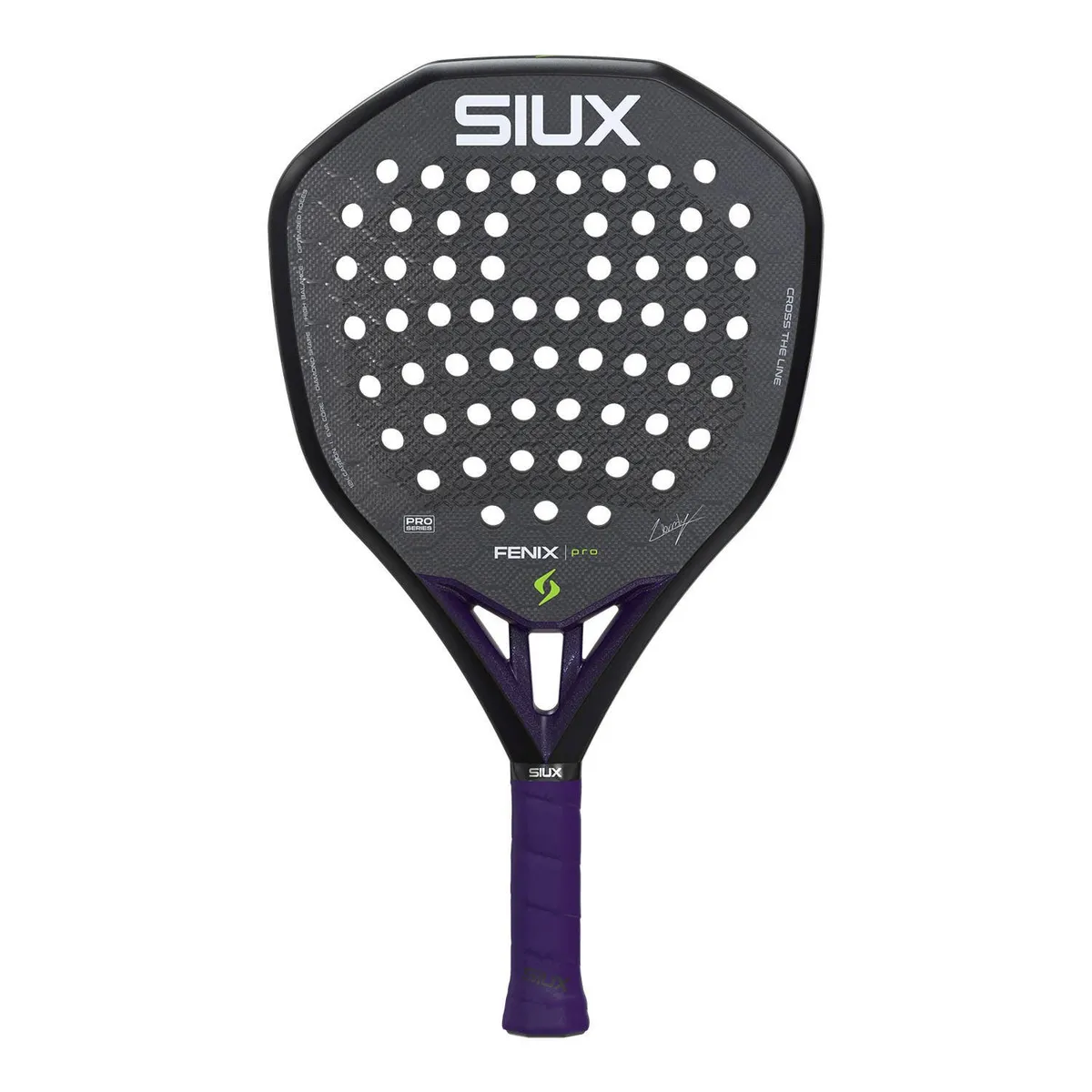 The Siux Fenix PRO Black 2026 Leo Augsburger is a power-focused flagship from Siux released in 2026. The diamond head shape and high balance are the immediate visual cues: this is a racket that puts mass and leverage toward the sweet spot to prioritize ball speed and punch.