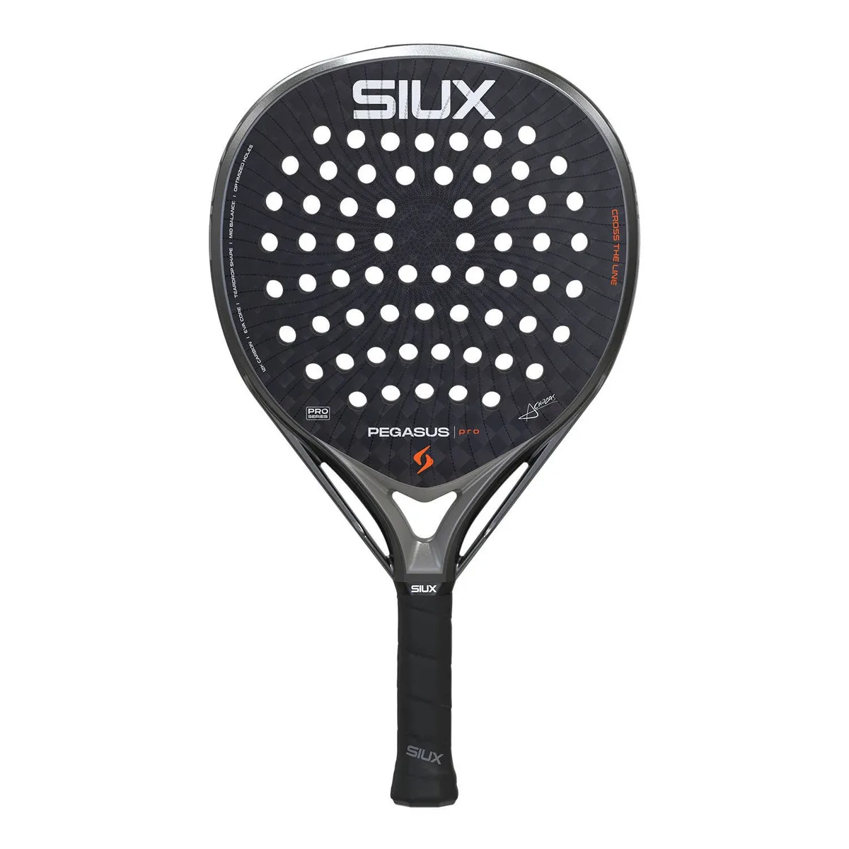 The Siux Pegasus PRO Storm Grey 2026 arrives as a clear entry in Siux’s advanced line-up, aimed at players who want a power-forward tool without losing control. Its teardrop shape and medium-high balance bias the sweet spot slightly toward the head, while a 12K carbon face and a hard EVA Pro core emphasize responsiveness and raw output. The finish is smooth and the overall profile reads as firm and composed, making it a confident choice for aggressive point construction on the court.